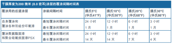 -最大覆涂間隔時(shí)間主要取決于表面的實(shí)際溫度 - 而不是簡(jiǎn)單地只看大氣溫度。置于太陽(yáng)直射暴曬或表面加熱的環(huán)境下, 涂層的最大覆涂間隔時(shí)間將會(huì)縮短。