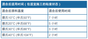 ?請確?;虾凸袒瘎┙M份在混合后的漆料溫度控制在攝氏10°C (華氏50°F)以上, 不然則可能需要額外添加稀釋劑將漆料粘度調(diào)整到適宜現(xiàn)場施工的粘稠狀態(tài)。