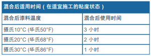 -當(dāng)在溫度范圍為攝氏66°C (華氏150°F) 至攝氏150°C (華氏300°F)的炙熱底材表面直接涂裝時, 敬請參閱“炙熱表面涂裝環(huán)氧漆”的信息表。